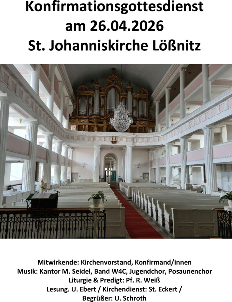 Am 28.03. findet um 17.00 Uhr in der Putzwolle Lößnitz unser II. Festvortrag zu 200 Jahre St. Johanniskirche statt. Bildvortrag mit Pf. i.R. Becher. Mit dabei: Gäste, Handwerker und Engagierte aus der Baugeschichte unserer St. Johanniskirche.